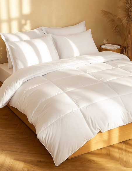 Véritable couette de haute qualité mélangeant douceur et légèreté, notre couette naturelle CORTINA est un excellent isolant thermique pour passer une bonne nuit.