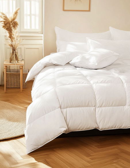 Sa composition en 50% duvet de canard et 50% plumettes fait d’elle une couette parfaite toutes saisons confondues ! De plus, son enveloppe en 100% percale 91 fils/cm² et son piquage carreaux cloisonnés vous assurent un équilibre parfait et une durabilité exemplaire.